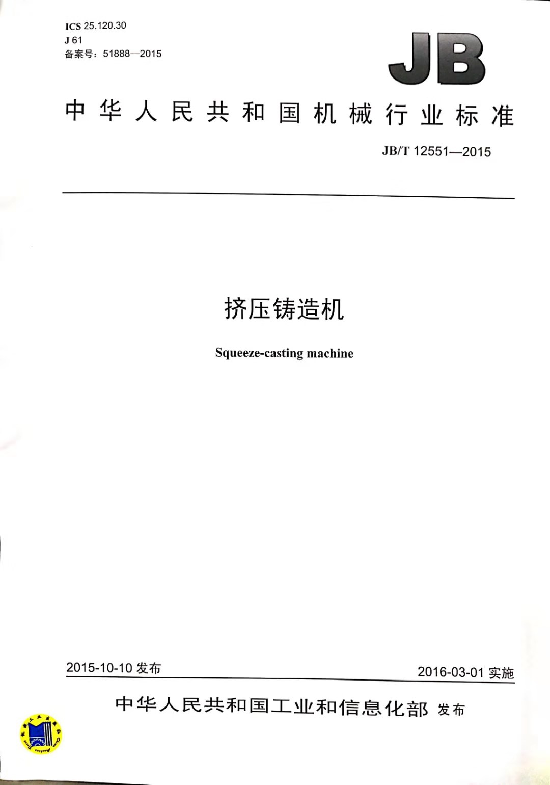 由蘇州三基鑄造裝備股份有限公司主持,哈爾濱吉星工程機(jī)械有限公司、中國兵器科學(xué)研究院寧波分院等單位參與制定的《擠壓鑄造機(jī)》行業(yè)標(biāo)準(zhǔn)于2015年10月10日發(fā)布,并于2016年3月1日起正式實(shí)施。該標(biāo)準(zhǔn)為國內(nèi)在擠壓鑄造領(lǐng)域制定的首個標(biāo)準(zhǔn)。