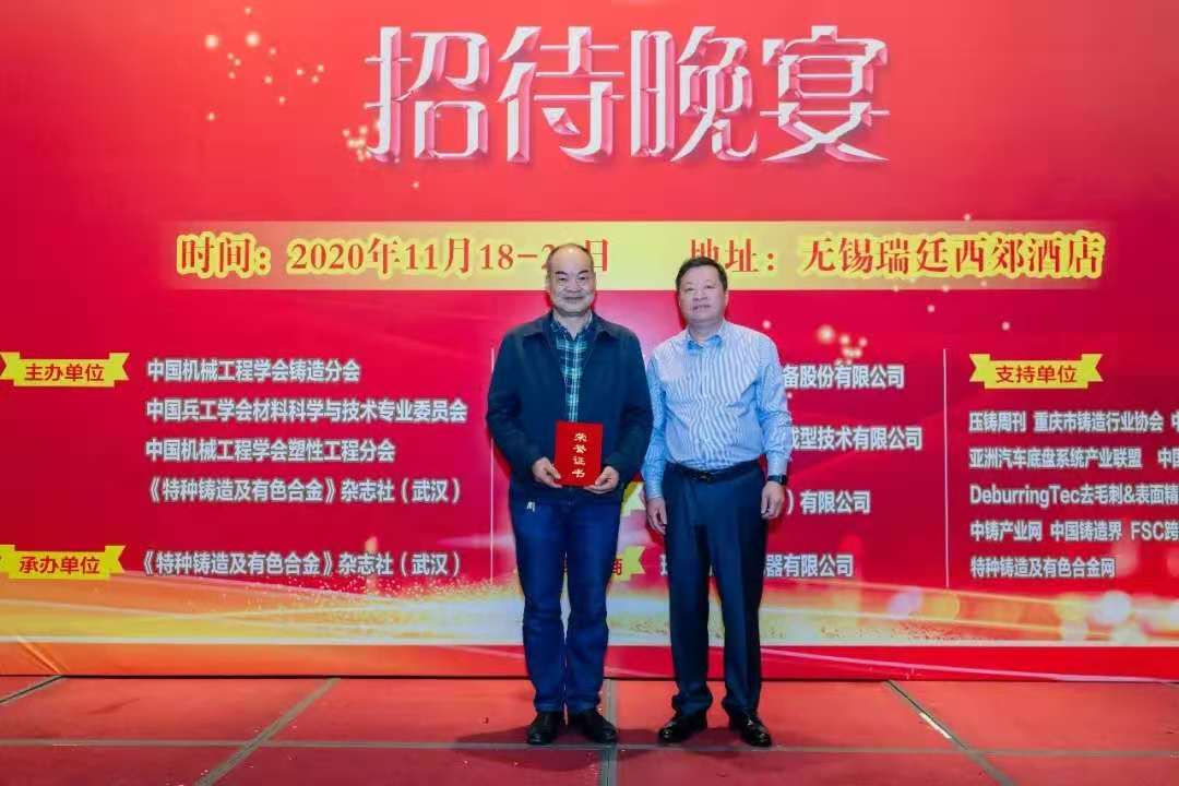 19日晚,舉行了“2019年特種鑄造及有色合金雜志優(yōu)秀論文”的頒獎(jiǎng)儀式暨嘉賓招待晚宴,許善新董事長(zhǎng)作為頒獎(jiǎng)嘉賓之一,為本次評(píng)比的金獎(jiǎng)?wù)撐摹都す獬尚涡迯?fù) K418高溫合金的微觀組織與硬度》的作者 - 西北工業(yè)大學(xué)劉建睿教授頒發(fā)了獲獎(jiǎng)證書(shū)。